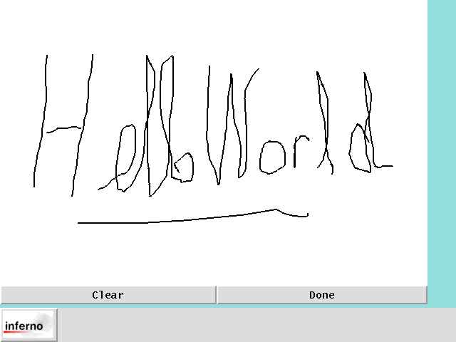 $ limbo -g hello.b $ emu Inferno main (pid=6559) interp Initialize Dis: /dis/sh.dis slocum.cs.bell-labs.com$ /usr/bwk/hello hello, world slocum.cs.bell-labs.com$