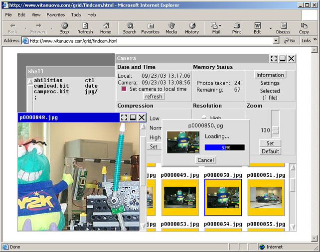 Inferno running as a plug-in within Internet Explorer. The screenshot shows the GUI of the camera service provided by the Vita Nuova demo grid. This service allows a user to remotely control a digital camera; altering settings such as zoom and flash as well as taking and downloading photos.